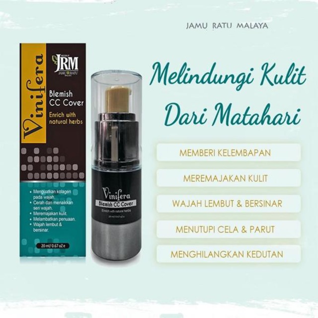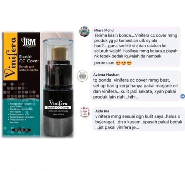 MUSTANIR RM 120 Add to cart. Review Vinifera Blemish CC Cover dari Jamu Ratu Malaya JRM Saya ni mudah terpengaruh rupanya hahaha. Vinifera Cc Cover SPF 48 Full Coverage Foundation Sunblock CC Cover Tahan Lama 6 bulan Sesuai Semua Jenis Kulit.